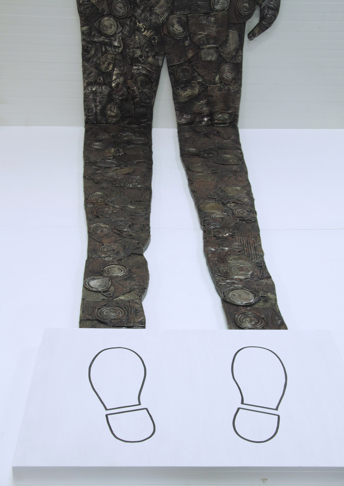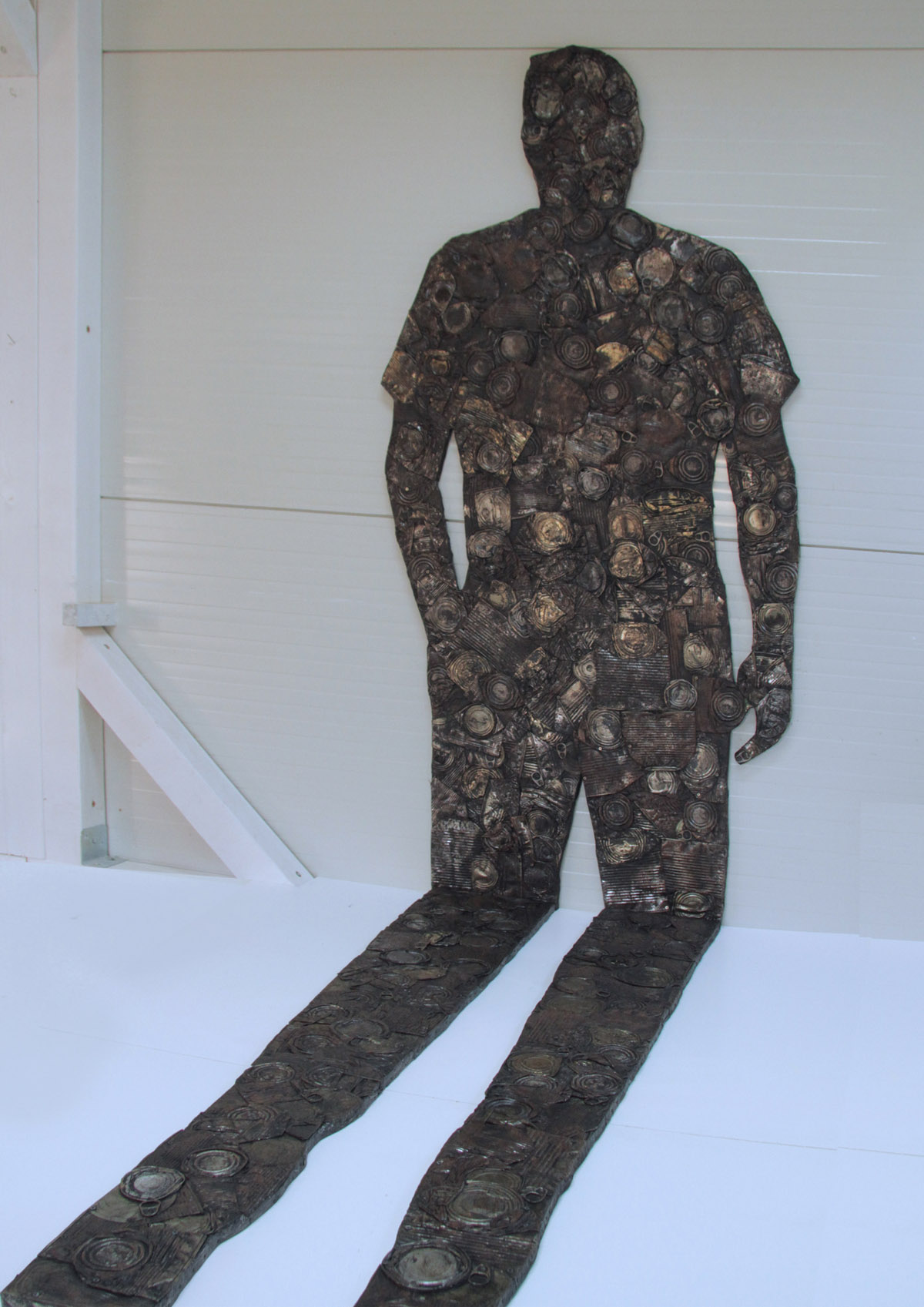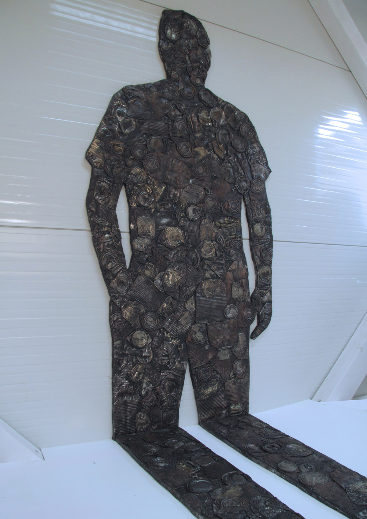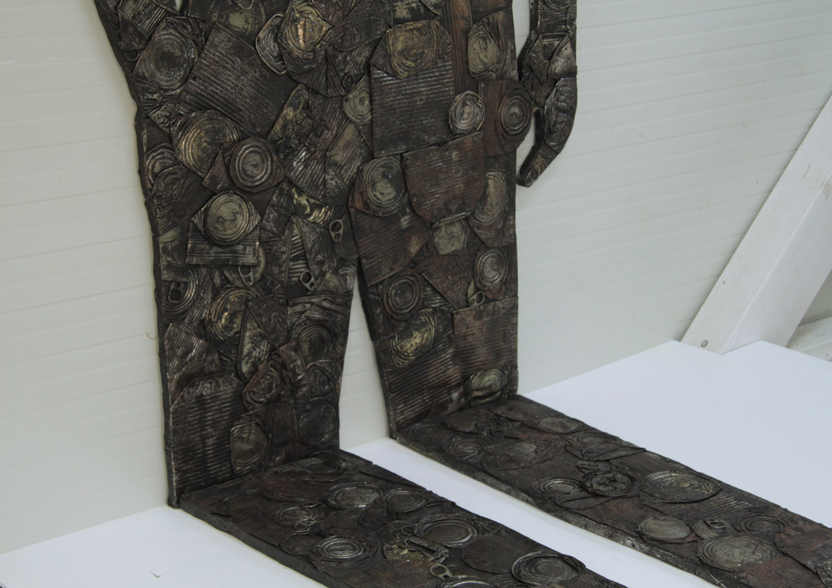 Objekt Sjena Antropocena / Surogat slika napravljen je od prešanih limenki pričvršćenih na drvenu podlogu u obliku bačene sjene čovijeka koja se lomi na zidu. U podnožju objekta nalazi se podij, sa pozicijom na koju promatrač može stati i preklopiti svoju sjenu sa siluetom od otpada. Dimenzije 180 x 90 x 200 cm.