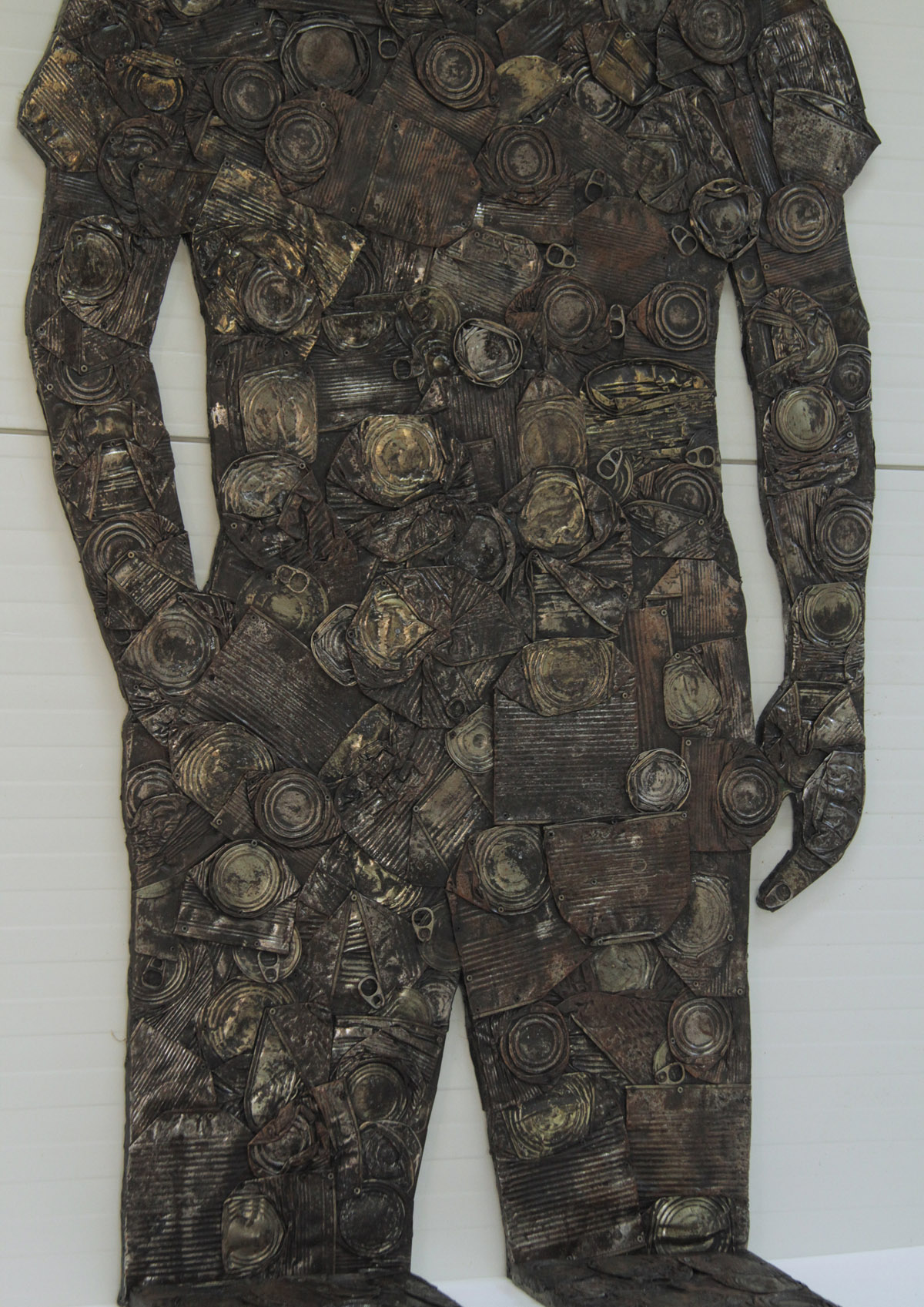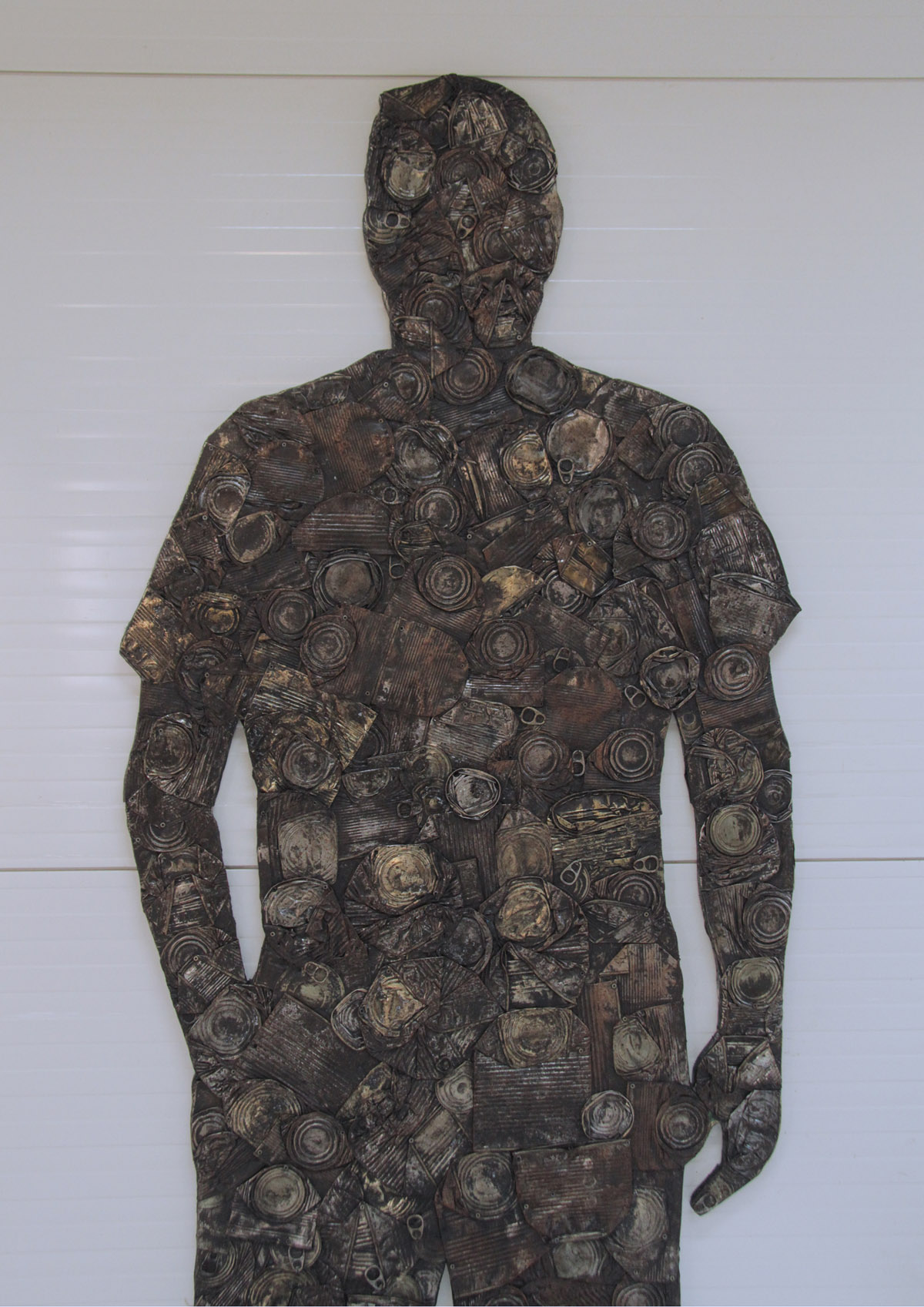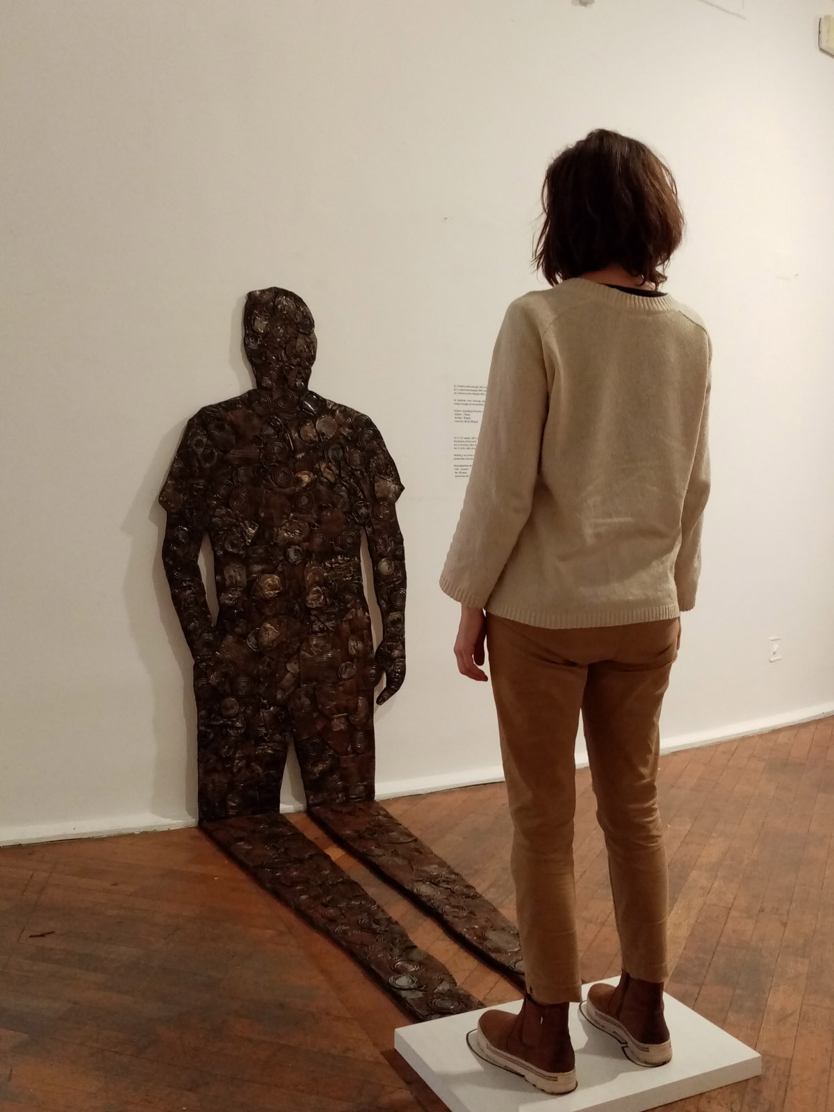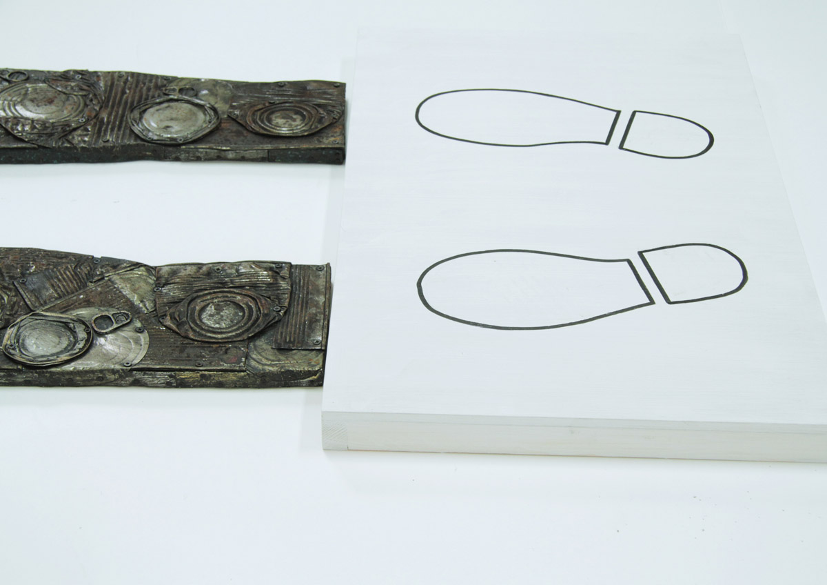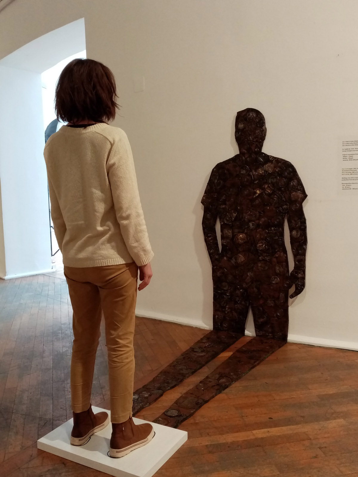 Objekt Sjena Antropocena / Surogat slika napravljen je od prešanih limenki pričvršćenih na drvenu podlogu u obliku bačene sjene čovijeka koja se lomi na zidu. U podnožju objekta nalazi se podij, sa pozicijom na koju promatrač može stati i preklopiti svoju sjenu sa siluetom od otpada. Dimenzije 180 x 90 x 200 cm.