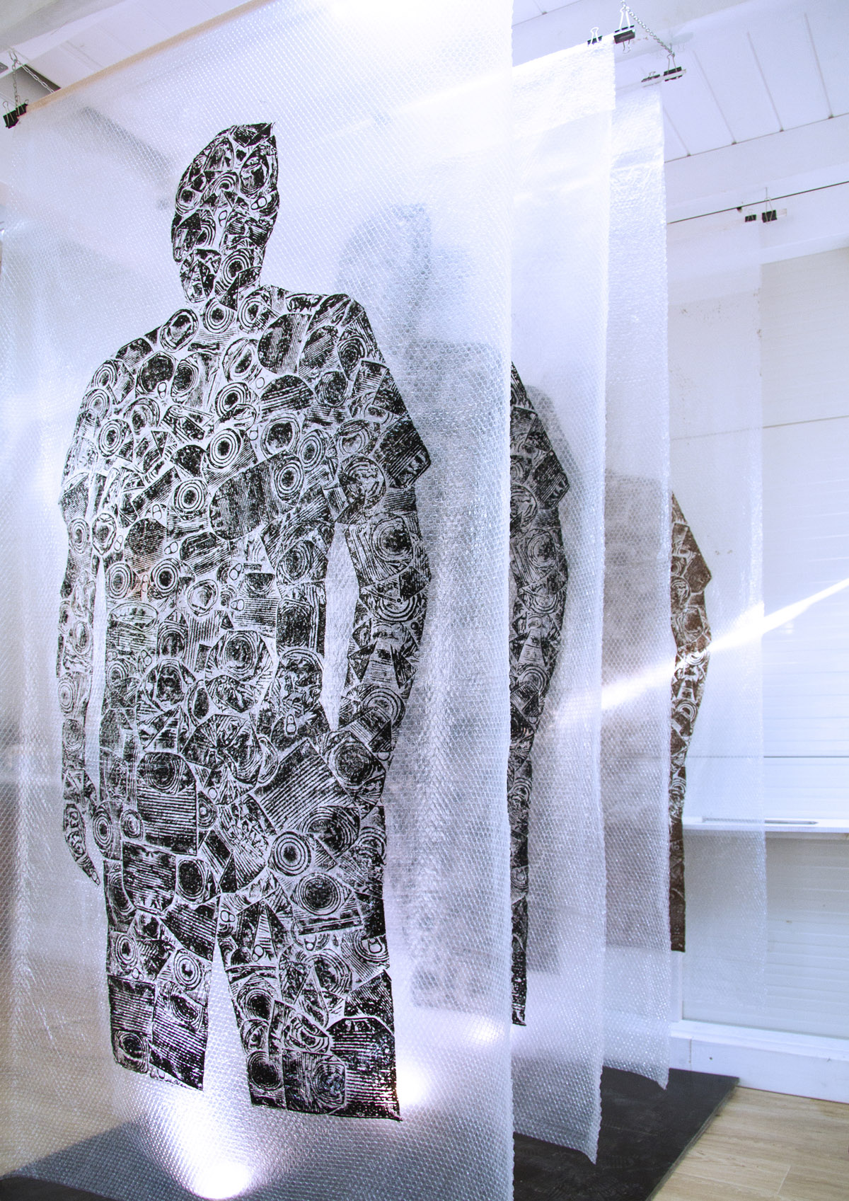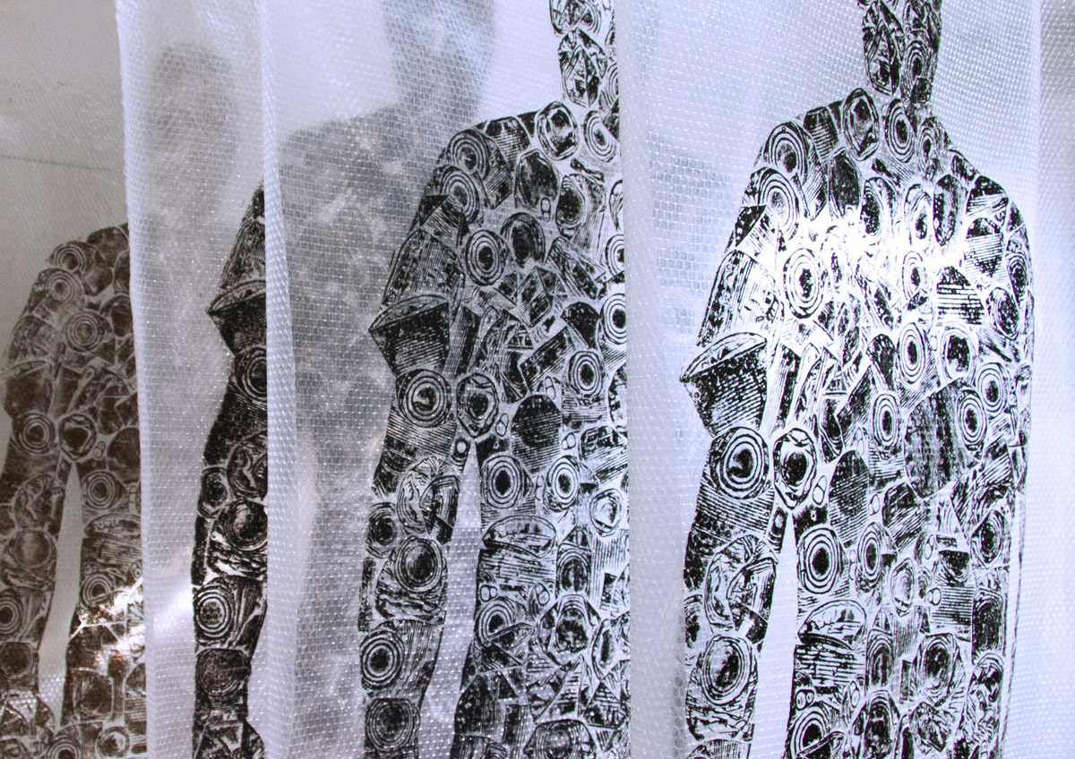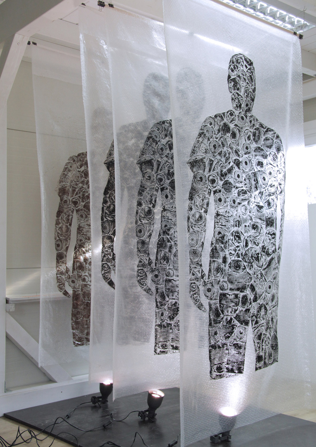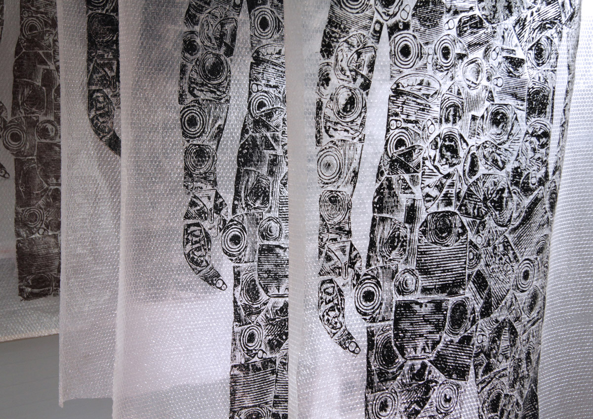 Rad se sastoji od četiri grafička otiska matrice na air bubble ambalažnom najlonu dimenzije 240 x 120 cm okomito obješenih u niz sa razmakom.