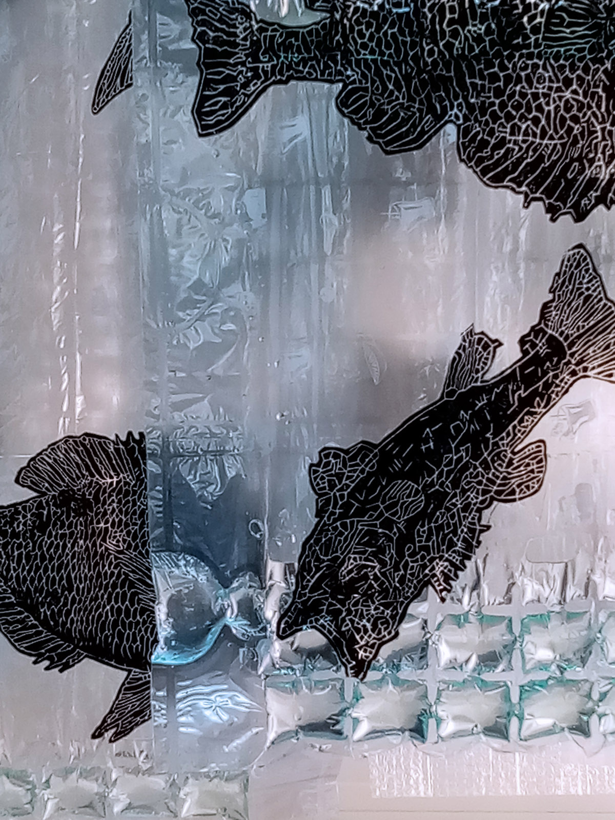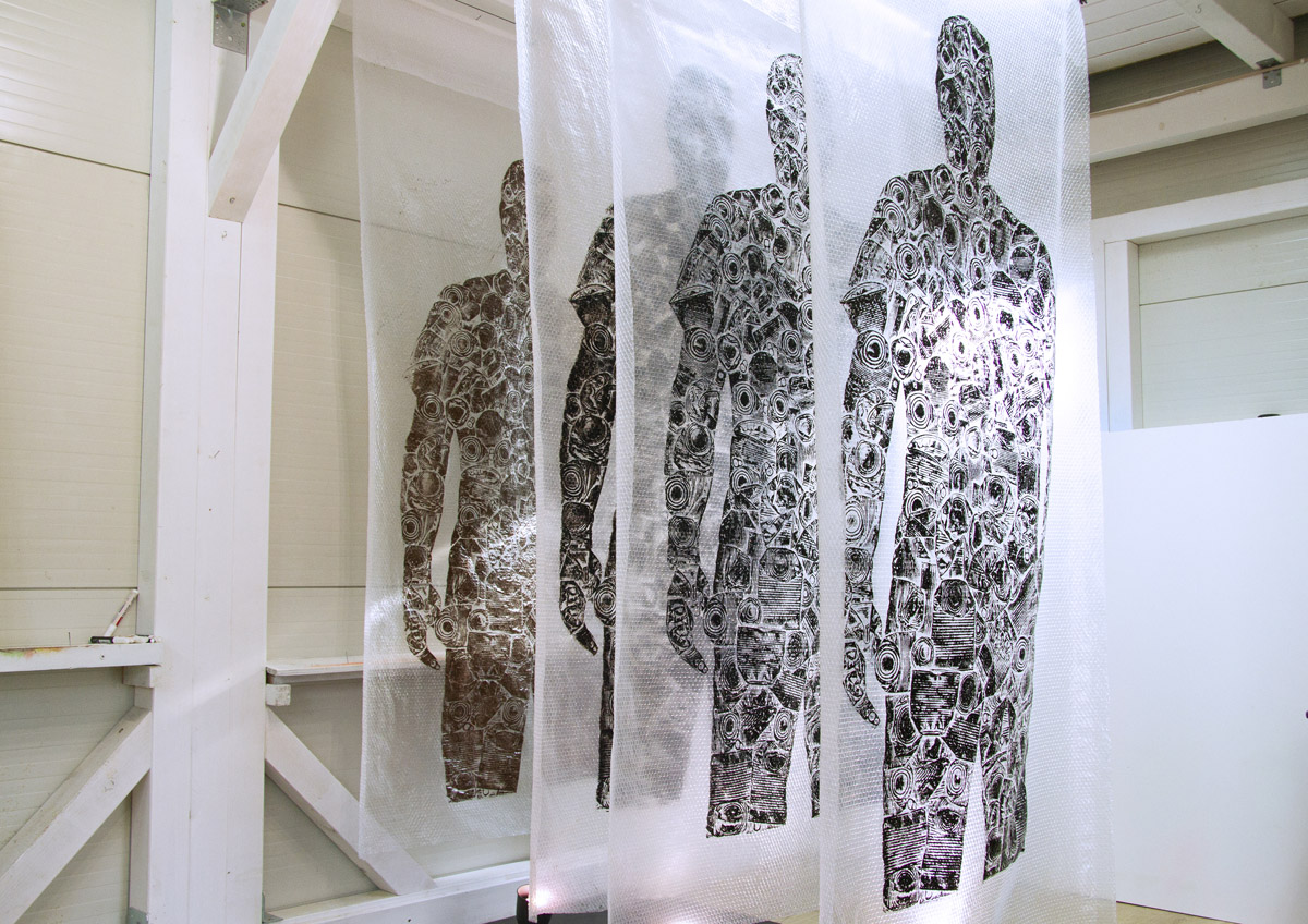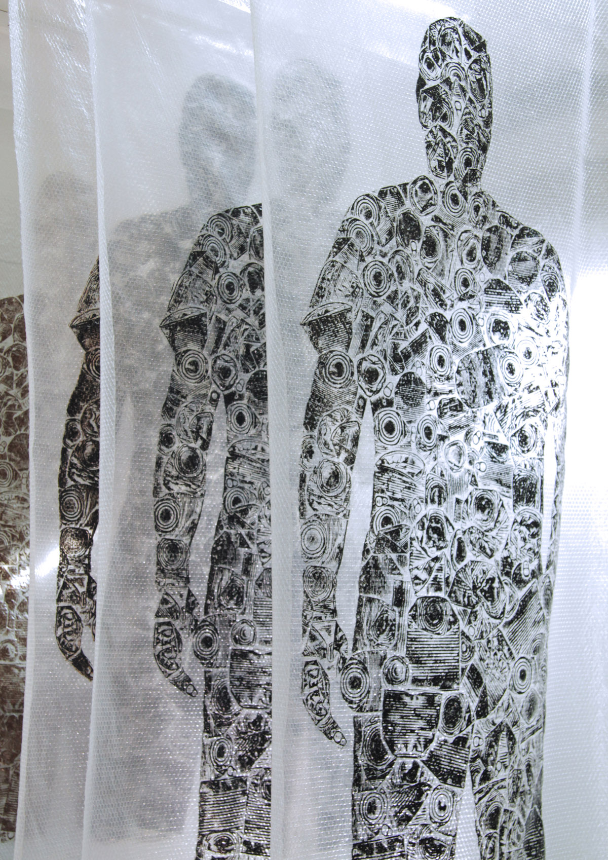 Rad se sastoji od četiri grafička otiska matrice na air bubble ambalažnom najlonu dimenzije 240 x 120 cm okomito obješenih u niz sa razmakom.
