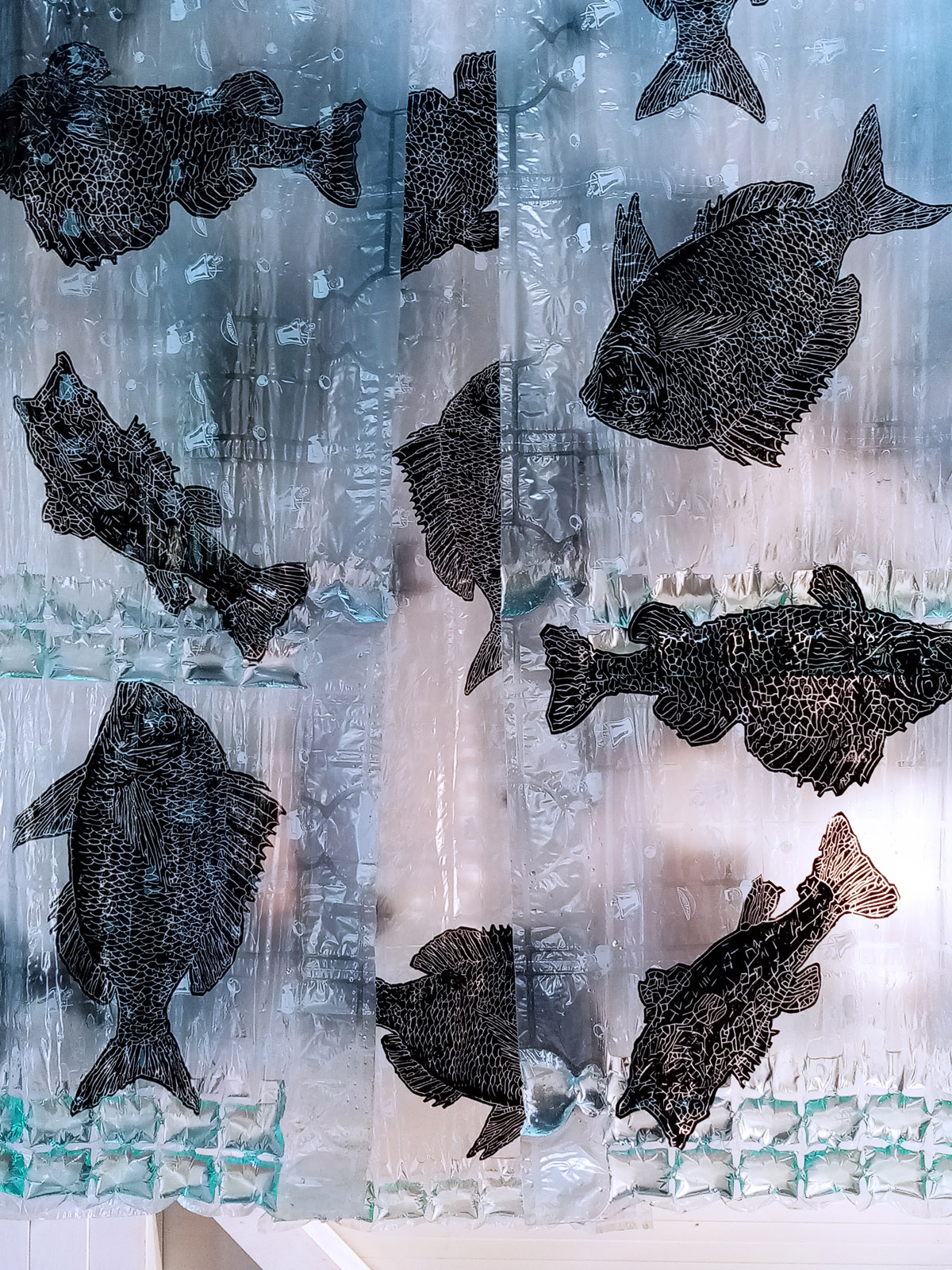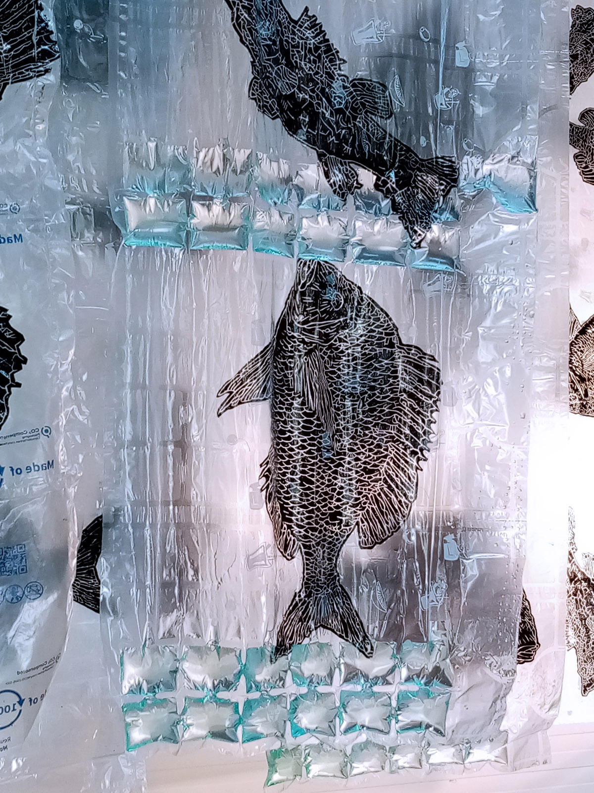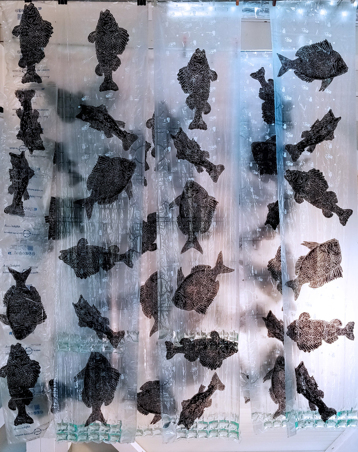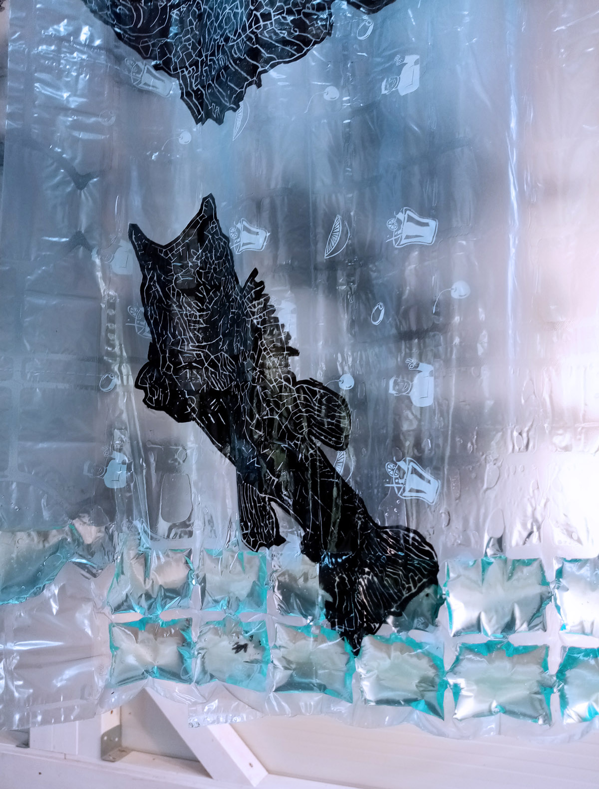 Rad se sastoji od četiri grafička otiska matrice na air bubble ambalažnom najlonu dimenzije 240 x 120 cm okomito obješenih u niz sa razmakom.